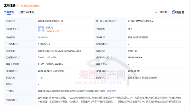爱企查资料显示,福州上尚善置业有限公司成立于2025年5月12日,注册地位于福建省闽侯县荆溪镇厚屿社区厚屿300号研发综合实验楼11层1106室,法定代表人为俞风和。