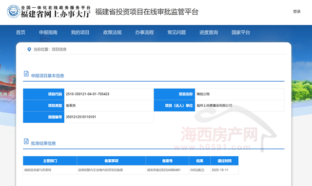 海西房产网(微信公众号:fjhxfcw)消息:福建省投资项目在线审批监管平台公布信息显示,“臻悦公馆”已于10月11日通过备案报建。
