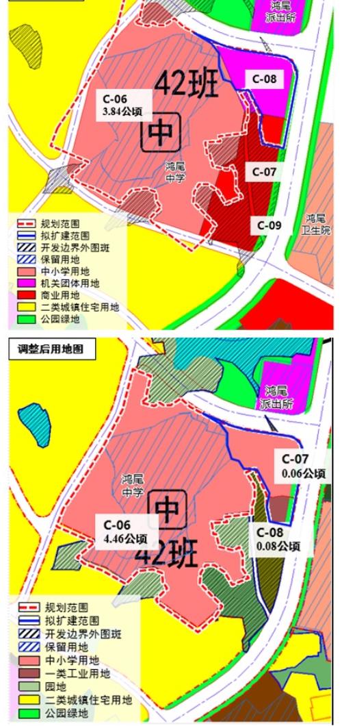调整之后,6幅地块缩减为3幅,C-06为中小学用地,面积从原来的3.84公顷扩大为4.46公顷。从57.6亩变为67.95亩,增加了10.35亩。容积率1.2,建筑密度为25%,建筑高度24米,绿地率35%。该教育用地为鸿尾中学,规划为42班,这也意味着该校将进行扩建。