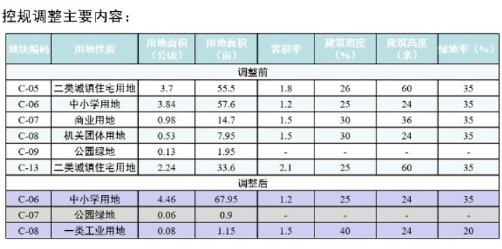 调整前,共有6幅地块,其中C-05、C-13为二类城镇住宅用地,C-06为中小学用地,C-07为商业用地,C-08为机关团体用地。