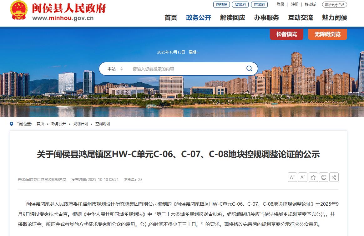 海西房产网(微信公众号:fjhxfcw)消息:2025年10月10日,闽侯县自然资源和规划局发布“关于闽侯县鸿尾镇区HW-C单元C-06、C-07、C-08地块控规调整论证的公示”。