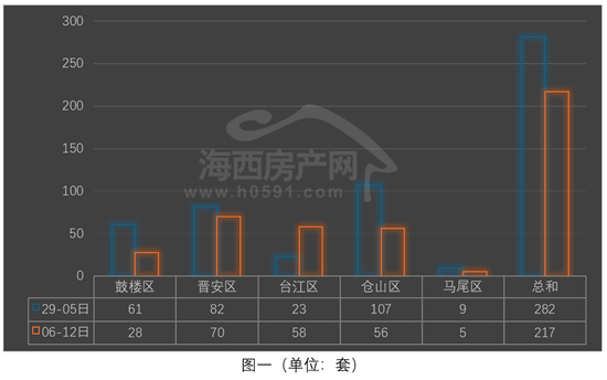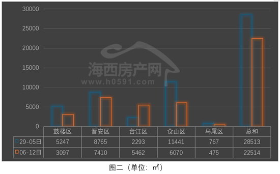 “鼓楼区”和“马尾区”位列倒数两位,上周分别签约28套和5套,环比前一周分别减少33套和4套。