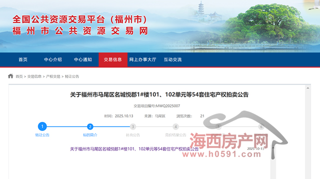 海西房产网(微信公众号:fjhxfcw)消息:10月13日,福建省晨至信拍卖行有限公司发布“关于福州市马尾区名城悦郡1#楼101、102单元等54套住宅产权拍卖公告”。