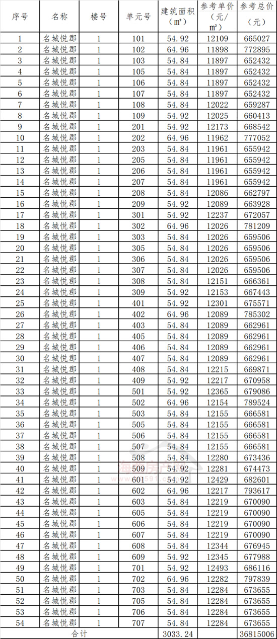 拍品清单明细表显示,本次拍卖马尾区名城悦郡1#54套房源总建筑面积3033.24㎡,参考总价36815006元,平均单价12137.18元/㎡。