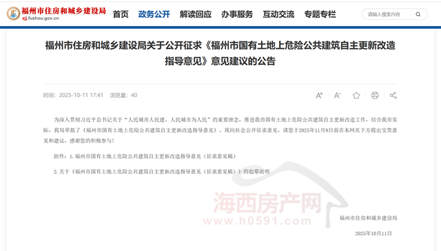 海西房产网(微信公众号:fjhxfcw)消息:10月11日,福州市住房和城乡建设局 发布“关于公开征求《福州市国有土地上危险公共建筑自主更新改造指导意见》意见建议的公告”。