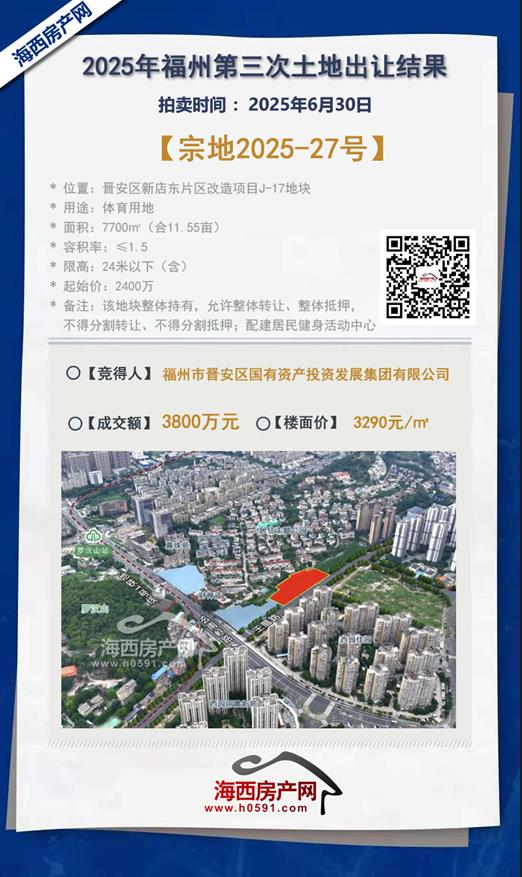 新店东片区改造项目J-17出让地块对应的为宗地2025-27号。今年6月30日,由福州市晋安区国有资产投资发展集团有限公司以0.38亿元竞得(楼面地价3290元/平方米),溢价率58%。