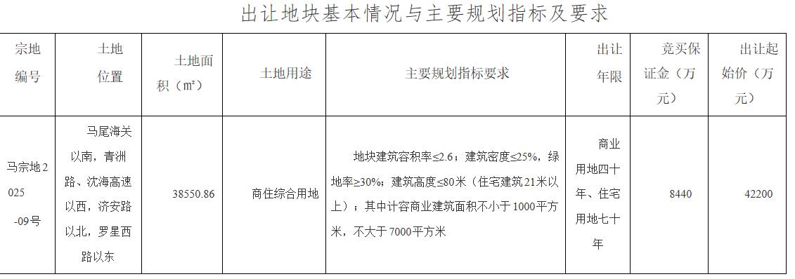 宗地编号马宗地2025-09号,土地位置马尾海关以南,青洲路、沈海高速以西,济安路以北,罗星西路以东。土地面积38550.86平米(折合57.83亩),土地用途为商住综合用地;土地出让年限商业用地四十年、住宅用地七十年。