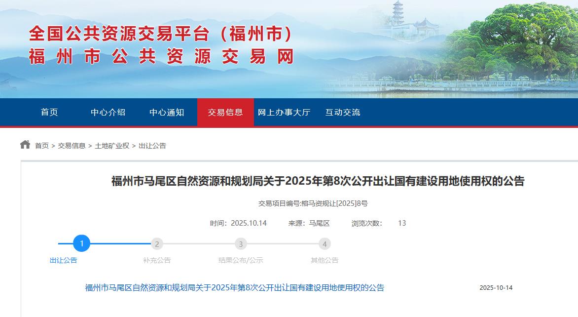 2025年10月14日,福州市马尾区自然资源和规划局发布“关于2025年第8次公开出让国有建设用地使用权的公告”。