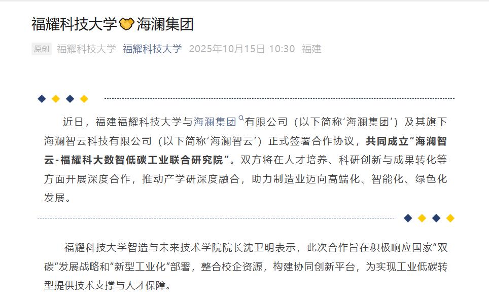 海西房产网(微信公众号:fjhxfcw)消息:据“福耀科技大学”10月15日报道,近日,福建福耀科技大学与海澜集团有限公司(以下简称‘海澜集团’)及其旗下海澜智云科技有限公司(以下简称‘海澜智云’)正式签署合作协议,共同成立“海澜智云-福耀科大数智低碳工业联合研究院”。