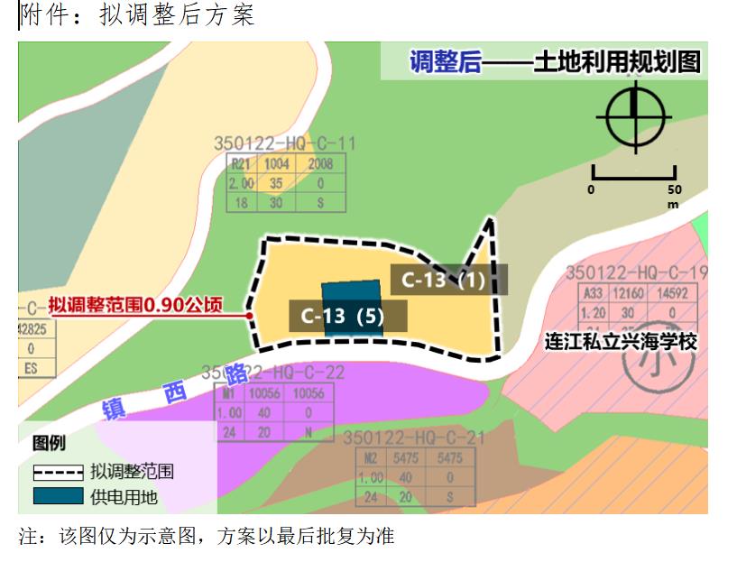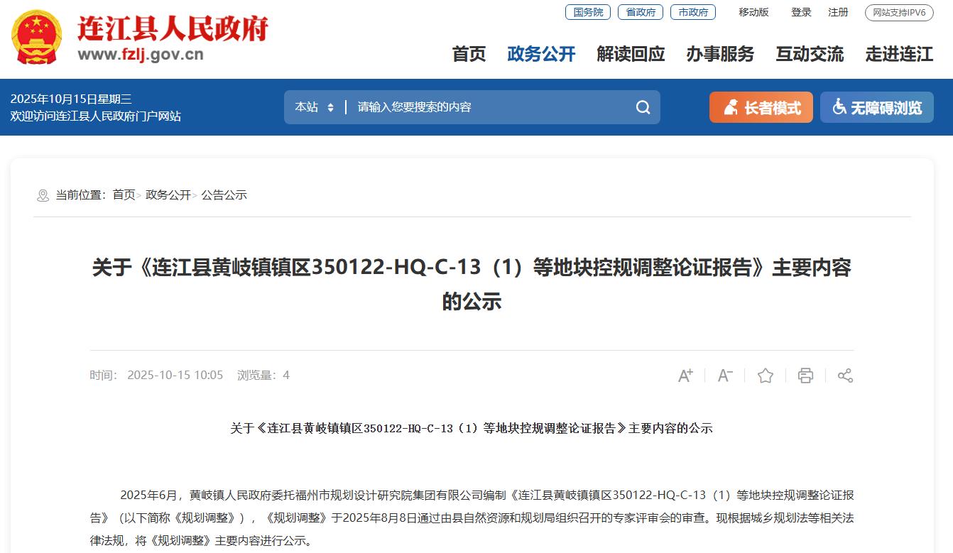2025年6月,黄岐镇人民政府委托福州市规划设计研究院集团有限公司编制《连江县黄岐镇镇区350122-HQ-C-13(1)等地块控规调整论证报告》(以下简称《规划调整》),《规划调整》于2025年8月8日通过由县自然资源和规划局组织召开的专家评审会的审查。