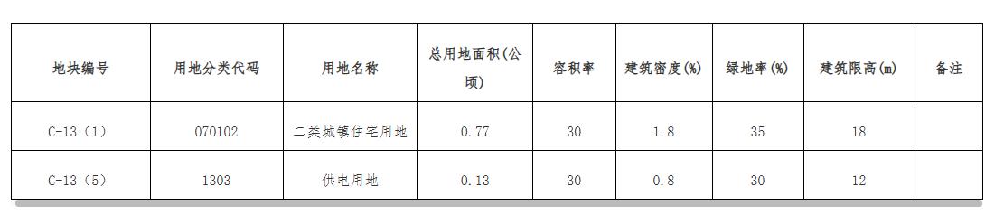 地块编号C-13(1),用地分类代码070102,用地名称二类城镇住宅用地,总用地面积0.77公顷,容积率30,建筑密度1.8%,绿地率35%,建筑限高18米。