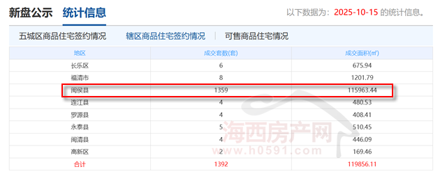 福州市不动产登记和交易中心公布信息显示,10月15日,闽侯县住宅签约1359套,面积115963.44㎡,份额占到整体的97.41%和96.75%。