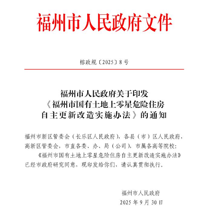 2025年9月30日,福州市人民政府发布“关于印发《福州市国有土地上零星危险住房自主更新改造实施办法》的通知 ”。该办法已经市政府研究同意,现印发给各部门,请认真贯彻执行。