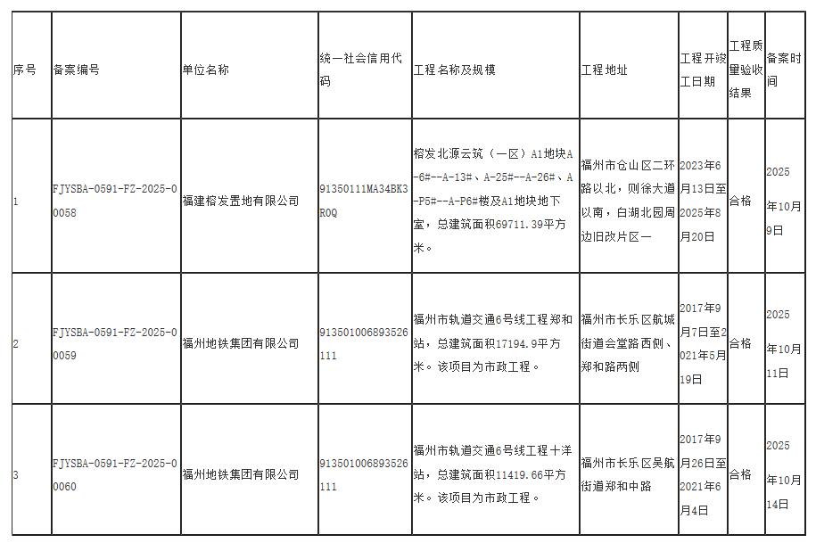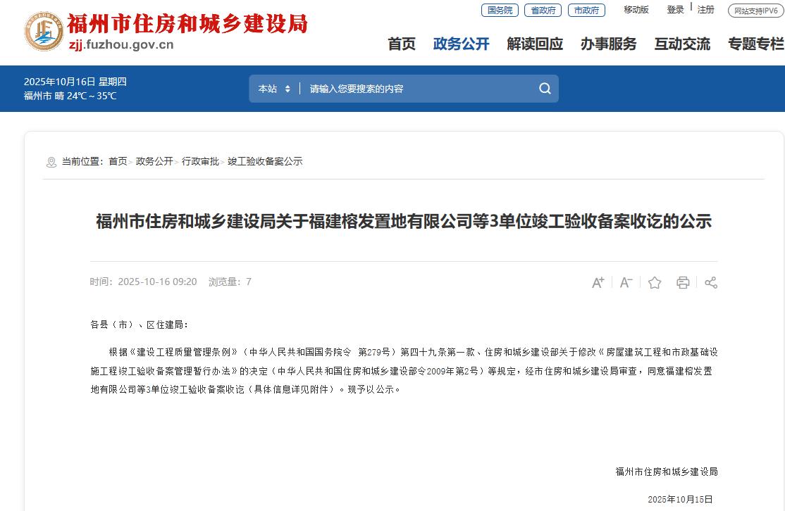 2025年10月15日,福州市住房和城乡建设局发布“关于福建榕发置地有限公司等3单位竣工验收备案收讫的公示”。