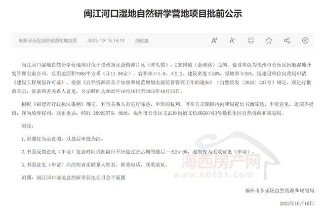 海西房产网(微信公众号:fjhxfcw)消息:10月16日,福州市长乐区自然资源和规划局发布“闽江河口湿地自然研学营地项目批前公示”。