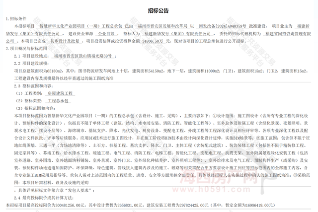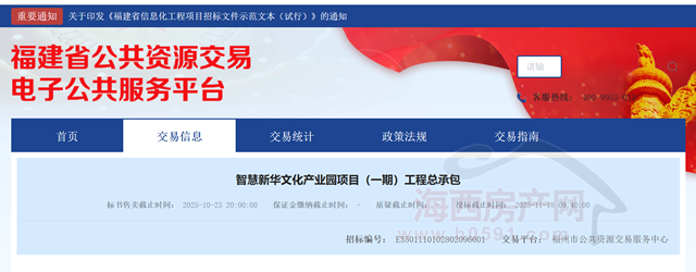 海西房产网(微信公众号:fjhxfcw)消息:10月16日,福建省公共资源交易网发布“智慧新华文化产业园项目(一期)工程总承包招标公告”。