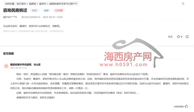 该咨询于近日得到福州市住建局、仓山区回复: