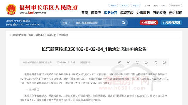 海西房产网(微信公众号:fjhxfcw)消息:10月17日,福州市长乐区自然资源和规划局发布“长乐新区控规350182-B-02-04_1地块动态维护的公告”。