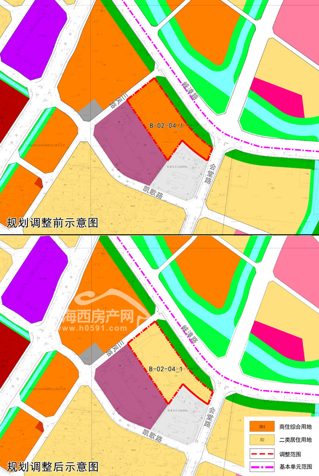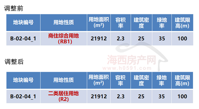 将B-02-04_1地块用地性质由商住综合用地(RB1)调整为二类居住用地(R2),调整后规划指标不变。