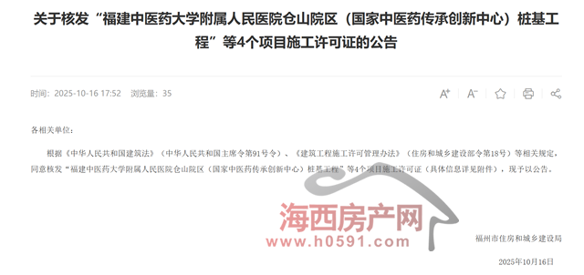2025年7月29日,福建省发展和改革委员会发布“关于同意福建中医药大学附属人民医院仓山院区(国家中医药传承创新中心)项目初步设计的函”。