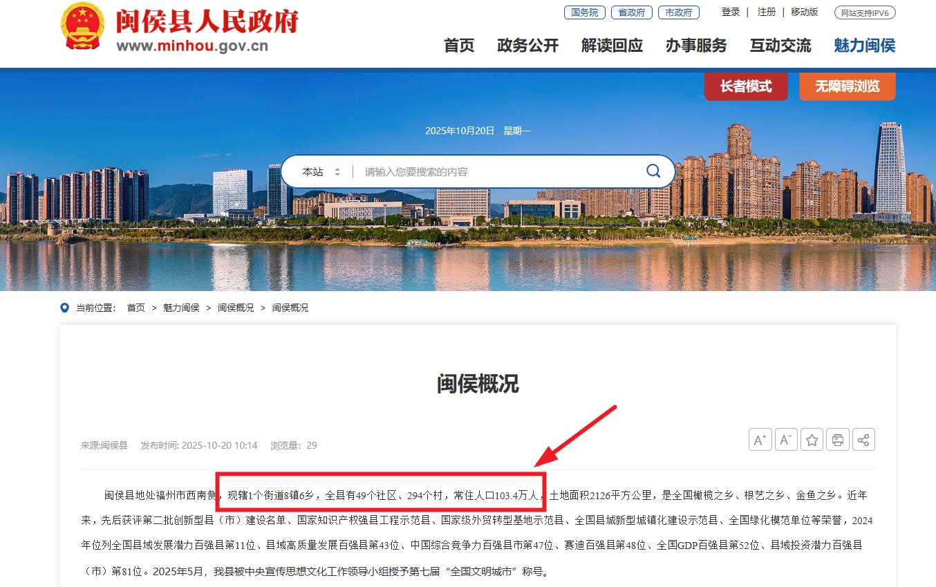 此外,闽侯县人民政府官网也于10月20日更新了闽侯概况,介绍闽侯县地处福州市西南侧,现辖1个街道8镇6乡,全县有49个社区、294个村,常住人口103.4万人,土地面积2126平方公里,是全国橄榄之乡、根艺之乡、金鱼之乡。