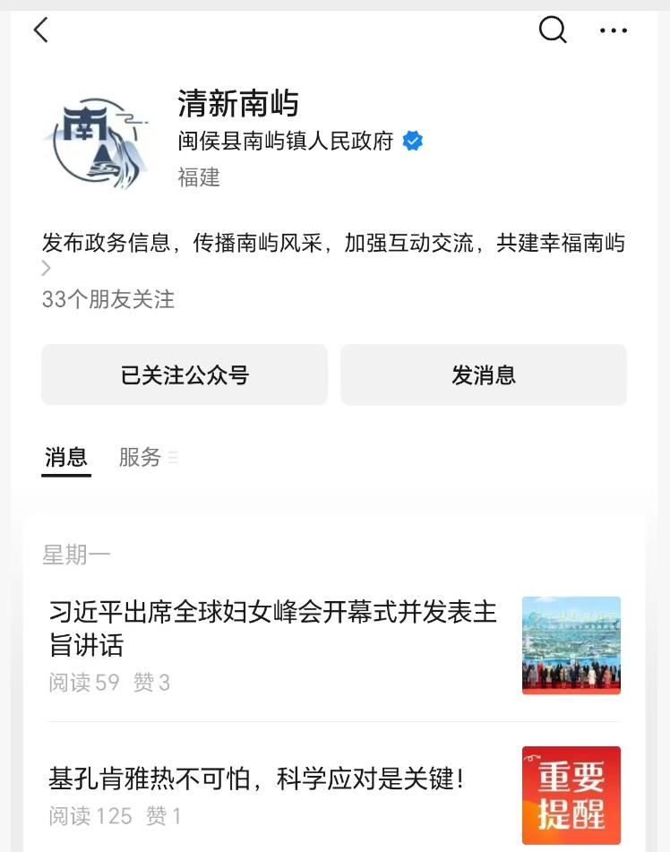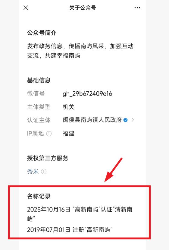 认证主体为闽侯县南屿镇人民政府的“高新南屿”,最早于2019年7月1日注册。2025年10月16日,该公众号名已认证为“清新南屿”。