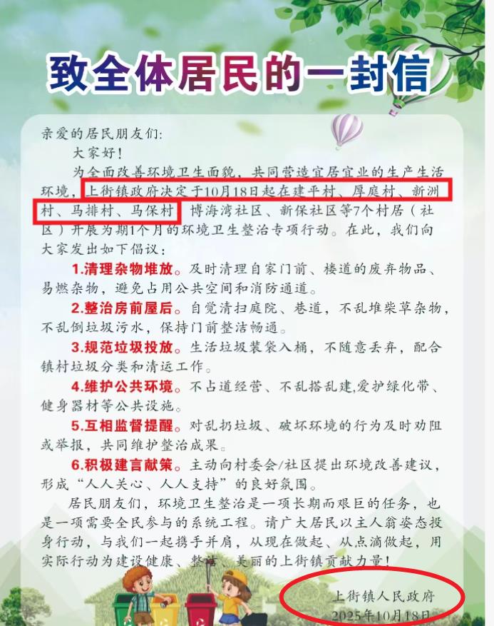 为全面改善建平村、厚庭村、新洲村、马排村、马保村、博海湾社区、新保社区(以下简称“5+2”村居)的环境卫生面貌,提升居民生活质量,营造整洁、优美、宜居的人居环境,上街镇于10月18日起在“5+2”村居开展环境卫生整治专项行动。