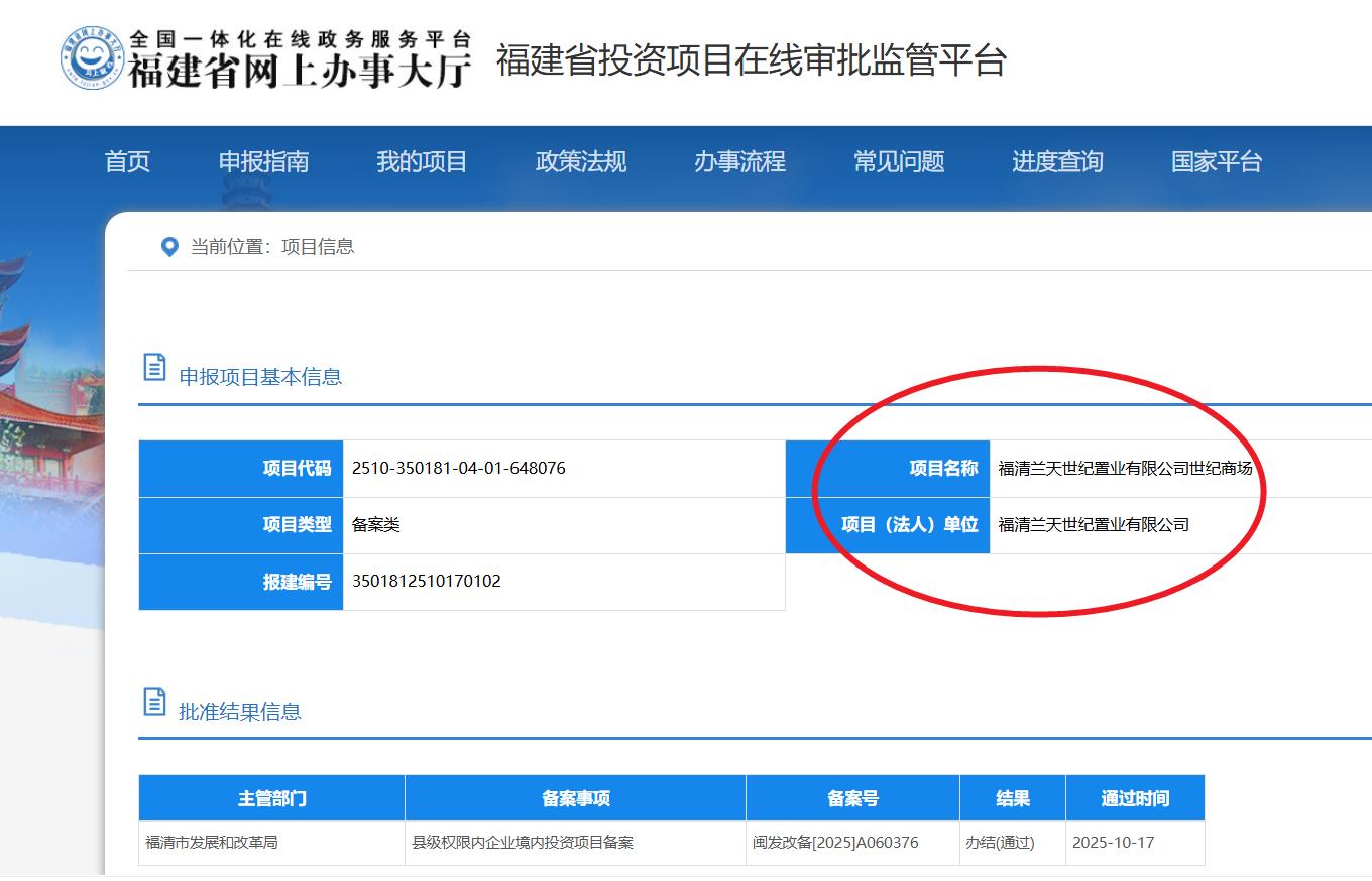 海西房产网(微信公众号:fjhxfcw)消息:福建省投资项目在线审批监管平台发布信息显示,“福清兰天世纪置业有限公司世纪商场”已于10月17日取得县级权限内企业境内投资项目备案,批准结果信息为办结(通过)。