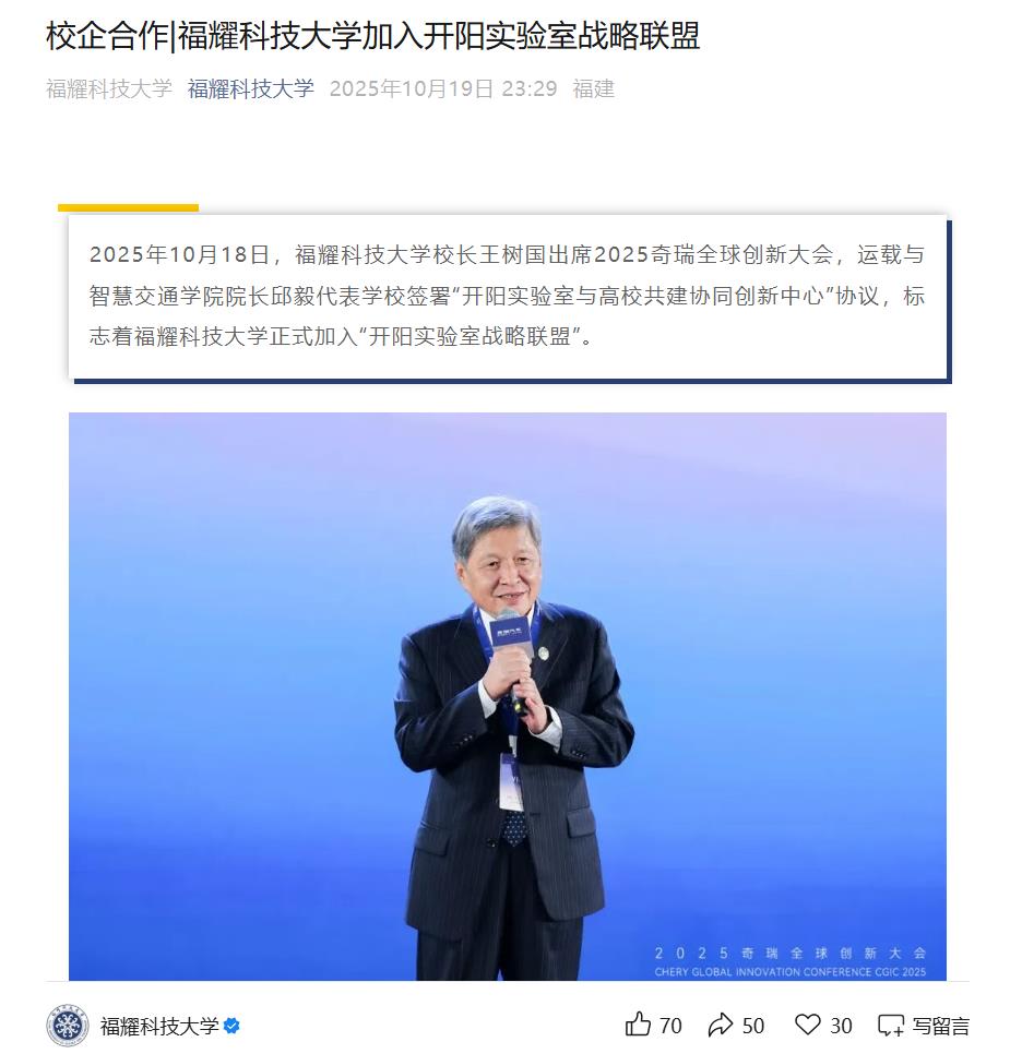 其中,福耀科技大学校长王树国出席2025奇瑞全球创新大会,运载与智慧交通学院院长邱毅代表学校签署“开阳实验室与高校共建协同创新中心”协议,标志着福耀科技大学正式加入“开阳实验室战略联盟”。