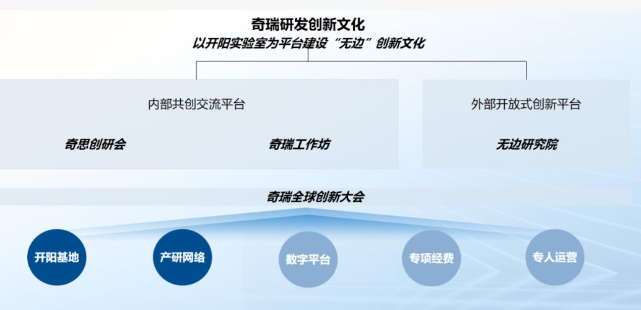 奇瑞汽车以开阳实验室为核心平台,构建独具特色的“无边”创新文化体系。以打破传统研发边界为理念,通过内部共创与外部开放式创新交流平台双轮驱动,依托开阳产学研网络和开阳全球分中心,打造奇瑞全球化创新生态。