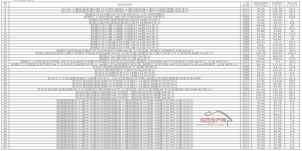 本次转让的51处房产涉及南台新苑(上渡旧屋改造工程)兰花园、鼓楼区洪山镇斗池路斗池新村、南街街道光禄坊97号灵响新村、晋安区茶园街道洋下新村、世欧王庄、凤翔商务公馆等楼盘,总面积3660.11㎡,挂牌价4760.75万元。
