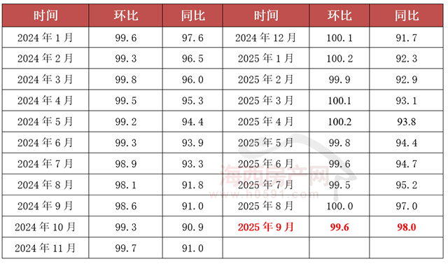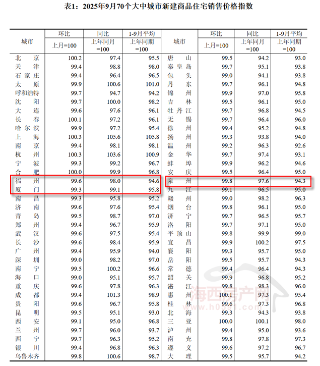国家统计局数据显示,2025年9月福州新建商品住宅销售价格环比下跌0.4%,同比下跌2.0%;厦门环比下跌0.7%,同比下跌0.9%;泉州环比下跌0.2%,同比下跌2.4%。