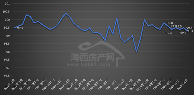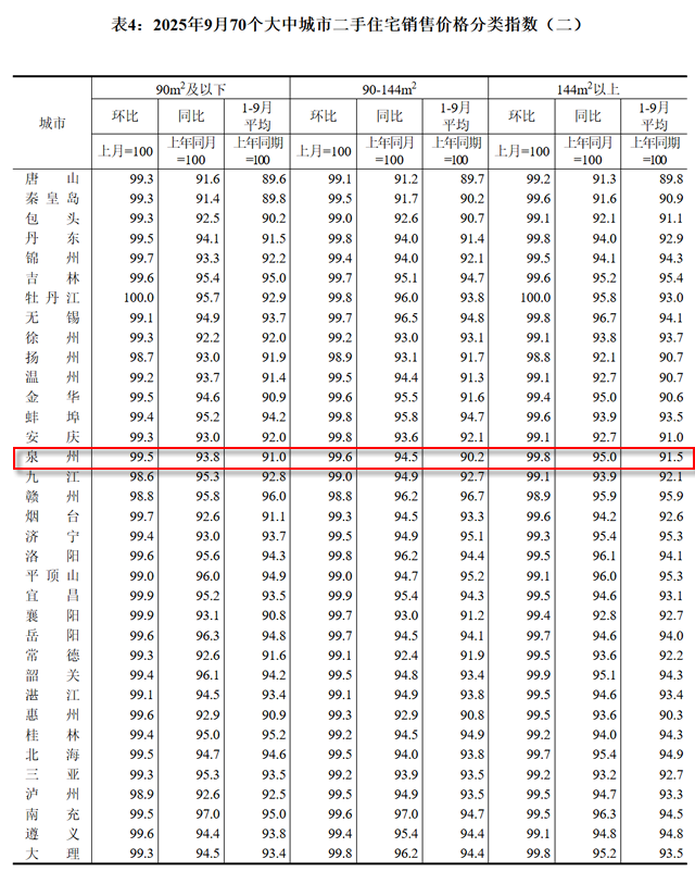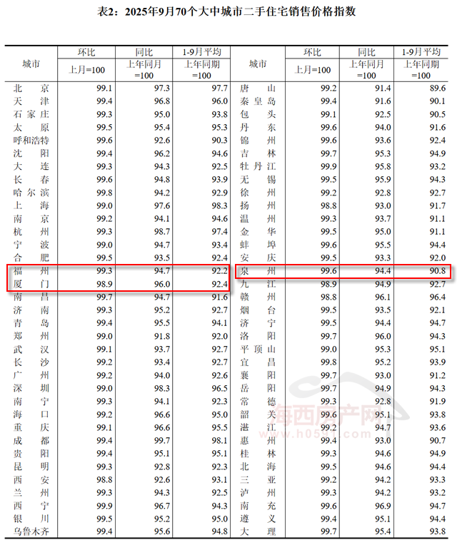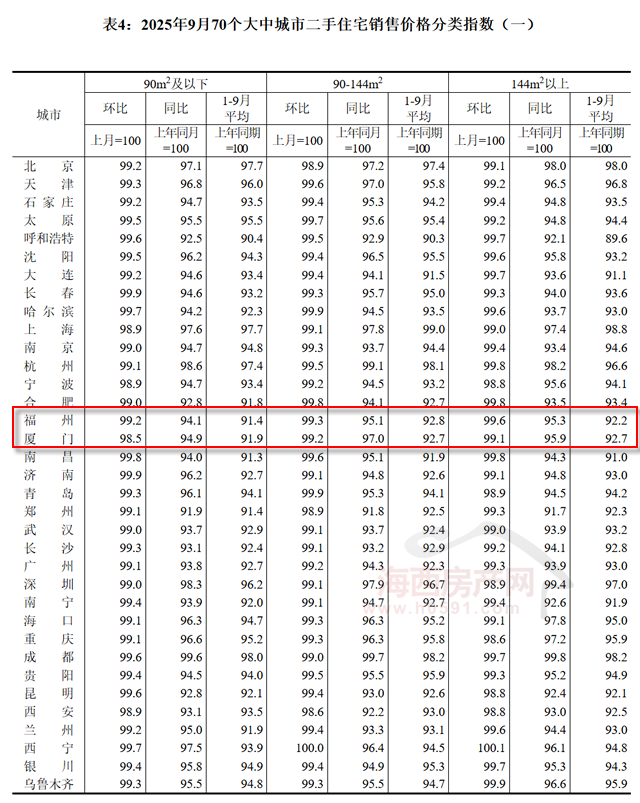 国家统计局数据显示,2025年9月福州二手住宅销售价格环比下跌0.7%,同比下跌5.3%;厦门环比下跌1.1%,同比下跌4.0%;泉州环比下跌0.4%,同比下跌5.6%。