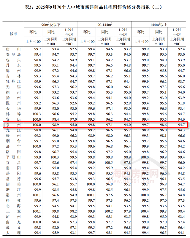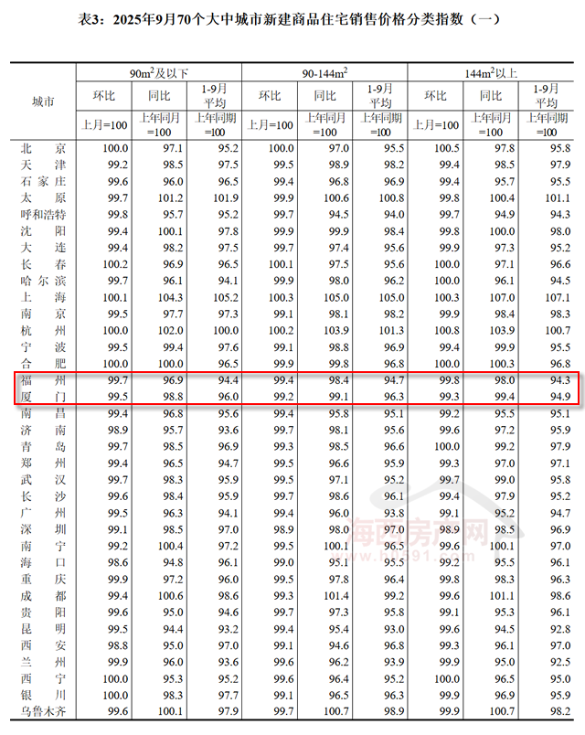 9月福州144㎡以上新建商品住宅销售价格环比下跌0.2%,同比下跌2.0%;厦门环比下跌0.7%,同比下跌0.6%;泉州环比下跌0.2%,同比下跌1.4%。
