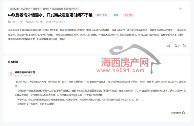 您好,欢迎通过人民网“领导留言板”留言!您留言反映的“中联御景湾外墙漏水,开发商故意拖延时间不予维修”事项,福州市住建局会同仓山区进行了调查处理。