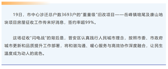 根据微信公众号“今日晋安”发文透露,19日,市中心涉迁总户数3693户的“重量级”旧改项目——岳峰镇琯尾及康山地块项目房屋征收工作传来好消息,签约率超99%。