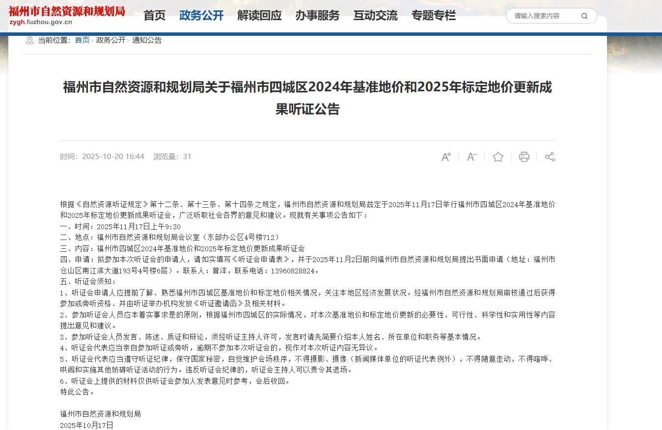 2025年10月17日,福州市自然资源和规划局发布“关于福州市四城区2024年基准地价和2025年标定地价更新成果听证公告”。