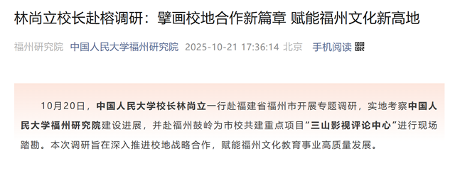 此行重点是为中国人民大学与福州市委宣传部共建的“三山影视评论中心”项目选址踏勘,推动该标杆性文化项目加速落地。