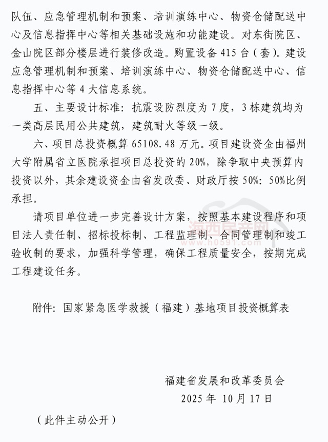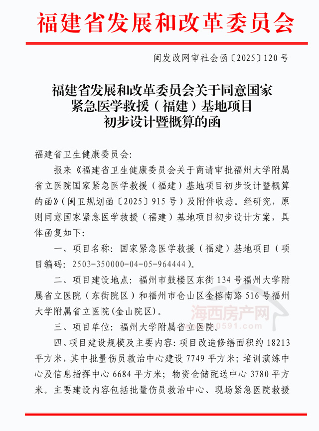 海西房产网(微信公众号:fjhxfcw)消息:10月21日,福建省发展和改革委员会发布“关于同意国家紧急医学救援(福建)基地项目初步设计暨概算的函”。