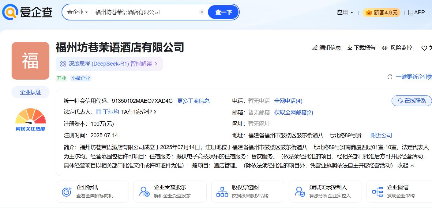 爱企查平台显示,福州坊巷茉语酒店有限公司成立于2025年7月14日,注册地位于福建省福州市鼓楼区鼓东街道八一七北路89号贤南商厦四层01室-10室。