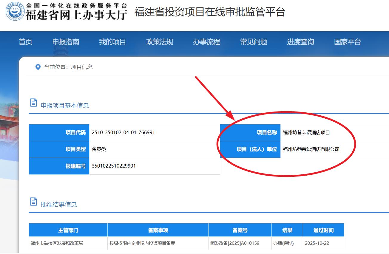 项目报建编号3501022510229901,项目(法人)单位为福州坊巷茉语酒店有限公司,备案号闽发改备[2025]A010159。主管部门为福州市鼓楼区发展和改革局 。