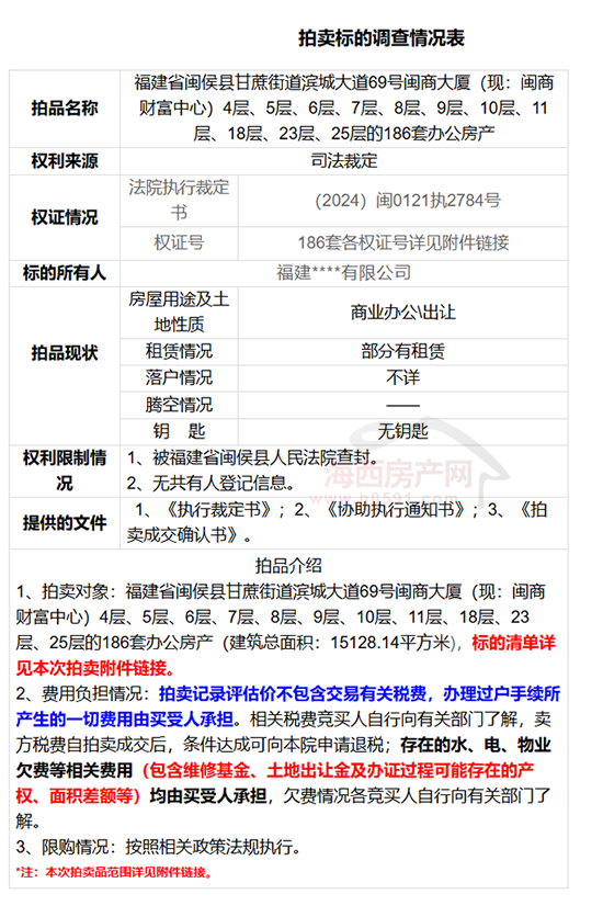 拍卖标的:福建省闽侯县甘蔗街道滨城大道69号闽商大厦(现:闽商财富中心)4层、5层、6层、7层、8层、9层、10层、11层、18层、23层、25层的186套办公房产((建筑总面积:15128.14平方米))。