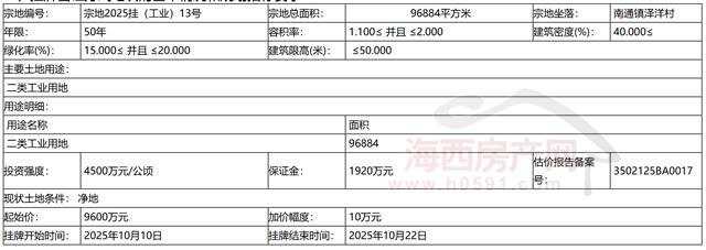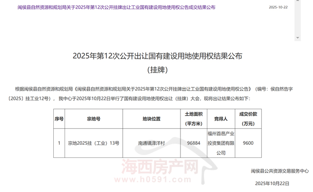 最终,福州首邑产业投资集团有限公司通过挂牌方式,以底价9600万元竞得宗地2025挂(工业)13号。