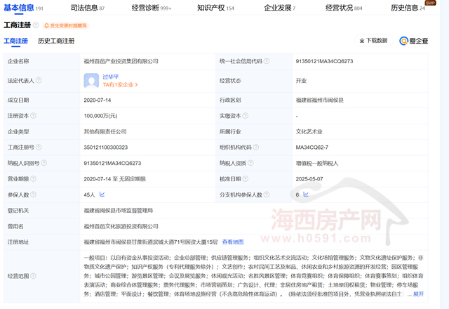 爱企查资料显示,福州首邑产业投资集团有限公司成立于2020年7月14日,注册地位于福建省福州市闽侯县甘蔗街道滨城大道71号国资大厦15层。