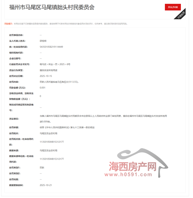 海西房产网(微信公众号:fjhxfcw)消息:10月15日,信用中国(福建福州)发布一则行政处罚信息【榕马农﹝林业﹞罚﹝2025﹞8号】。