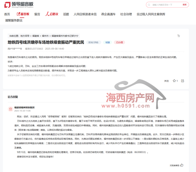 网友:您好,欢迎通过人民网“领导留言板”留言!您留言反映的“地铁四号线洪塘停车场地铁噪音振动严重扰民”问题,福州地铁集团进行了调查处理。