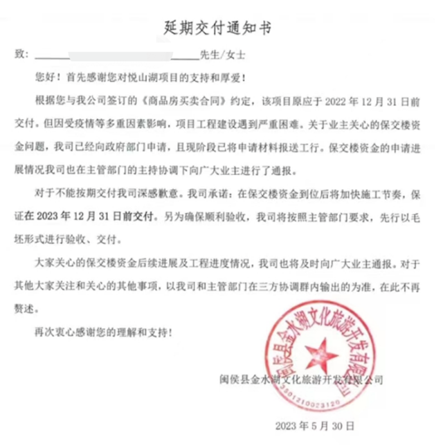 2023年5月30日,闽侯县金水湖文化旅游开发有限公司发给富力悦山湖业主一份延期交付通知书。