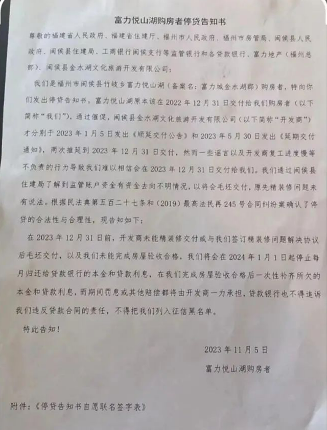 2023年11月,一则闽侯富力悦山湖业主发布的《购房者停贷告知书》在互联网上被广泛传播。