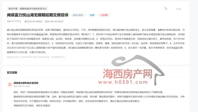 2023年6月16日闽侯县住房和城乡建设局在回复业主相关诉求时透露,富力悦山湖项目已被列入闽侯“保交楼”建设推进范围中,闽侯住建局已根据有关规定对接六大行申请保交楼金融计划支持资金,力争项目年内交房。