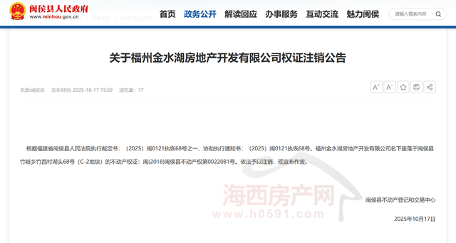 根据福建省闽侯县人民法院执行裁定书:(2025)闽0121执恢68号之一,协助执行通知书:(2025)闽0121执恢68号。福州金水湖房地产开发有限公司名下座落于闽侯县竹岐乡竹西村湖头68号(C-2地块)的不动产权证:闽(2018)闽侯县不动产权第0022081号。依法予以注销,现宣布作废。
